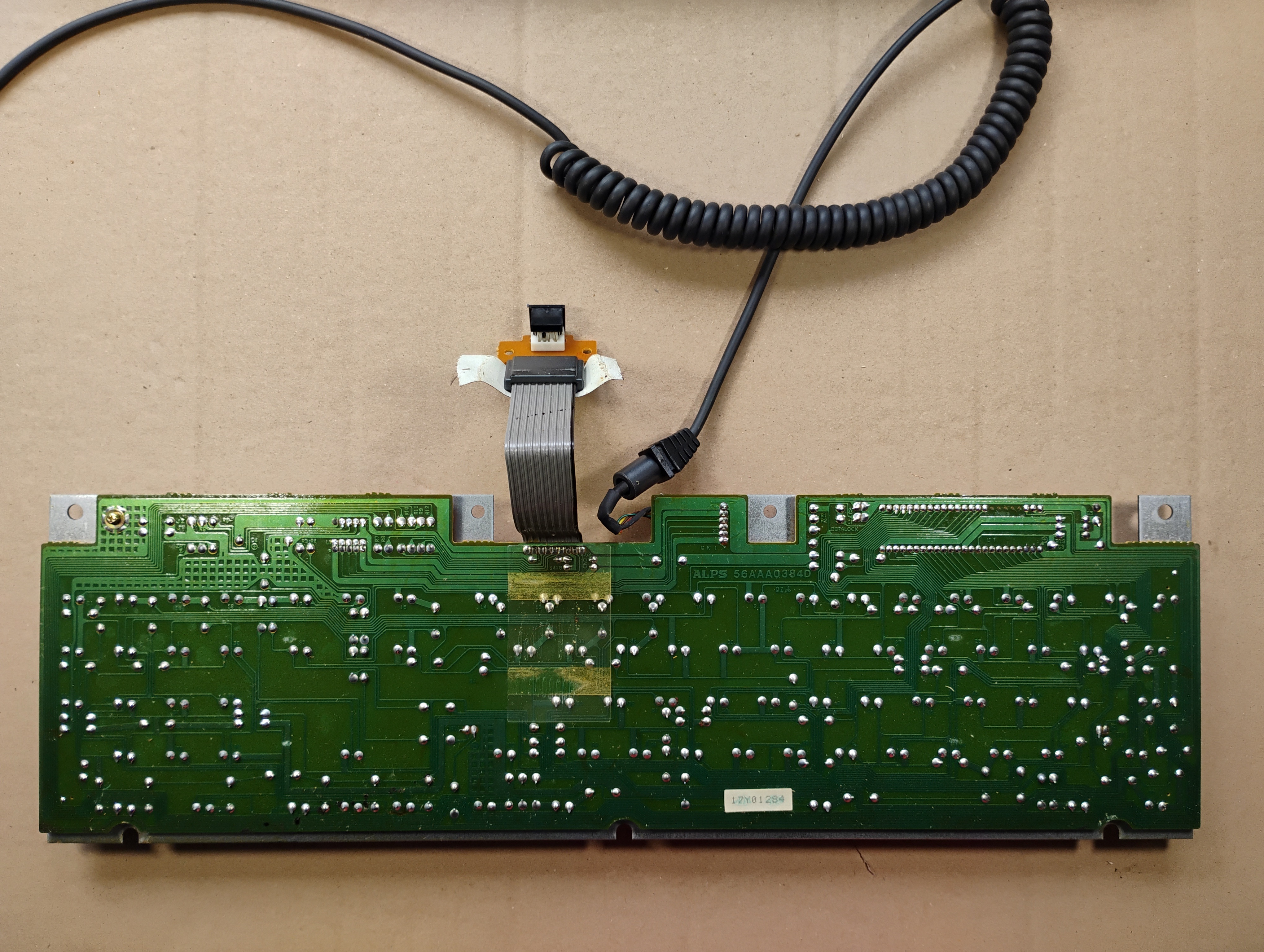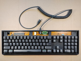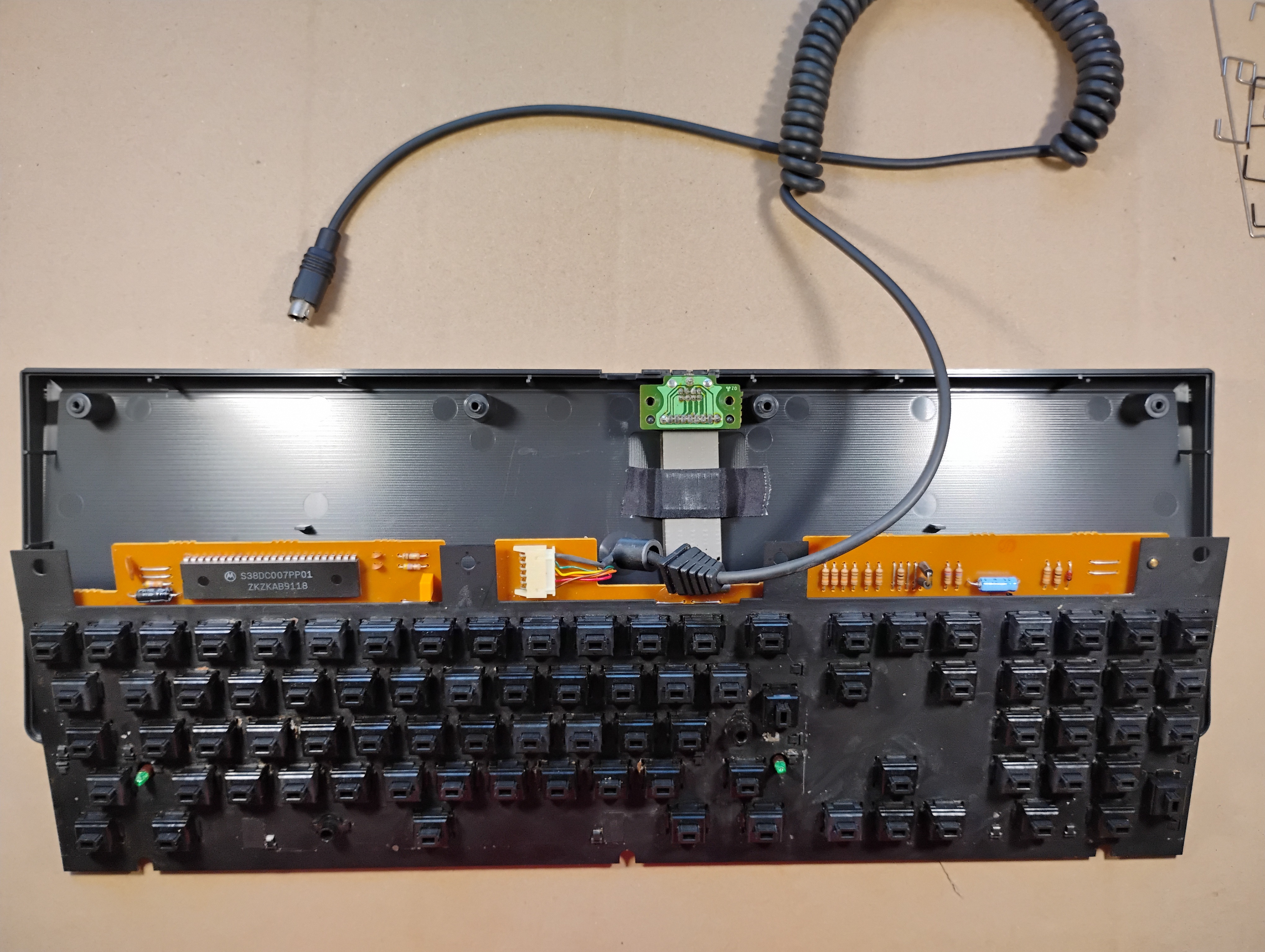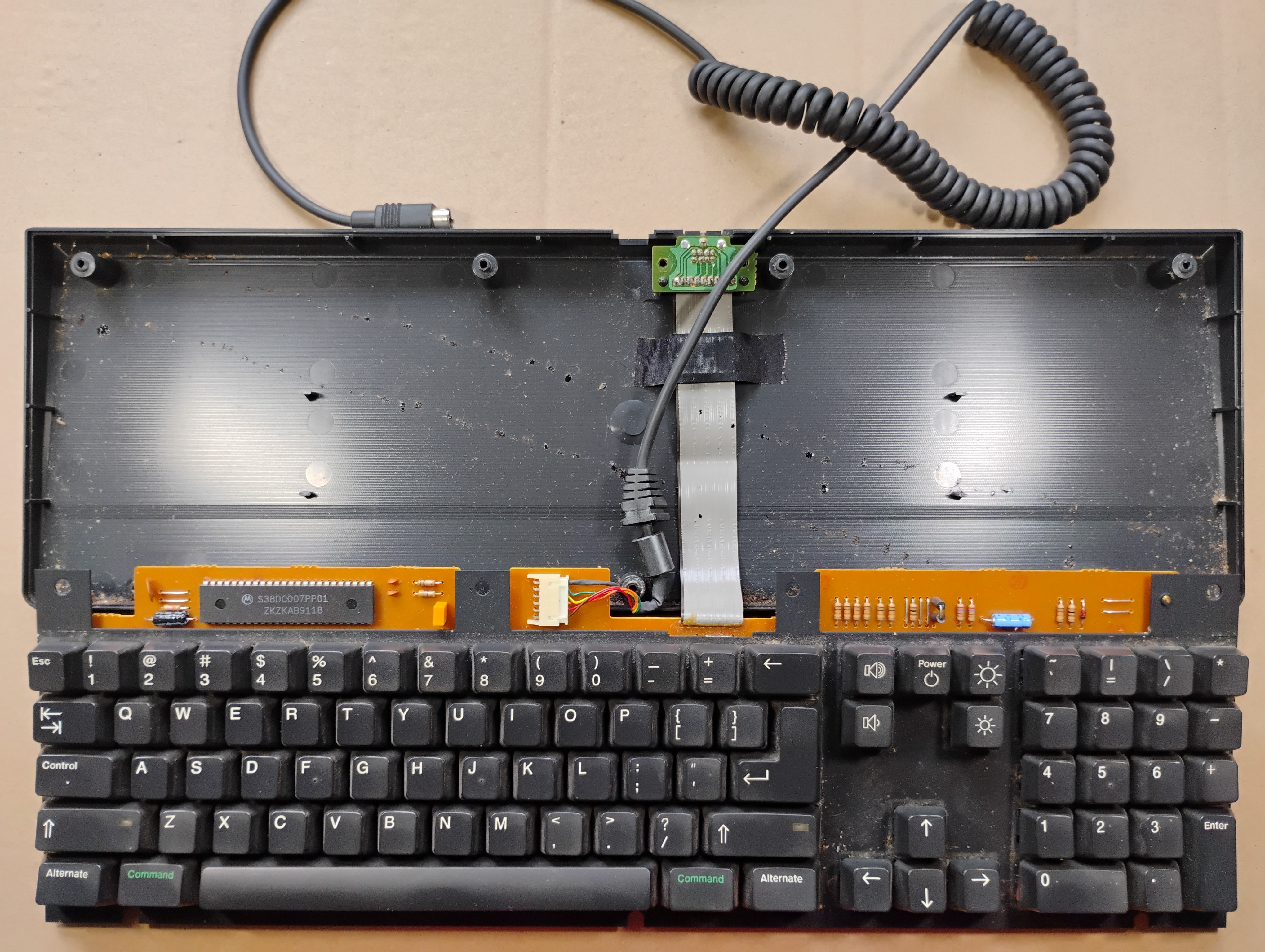 The flat cable for the mouse connector is actually pretty long and folded under the keyboard plate. The bottom cover is very dirty, and the water turned brown during cleaning... This keyboard drank coffee at one point . |