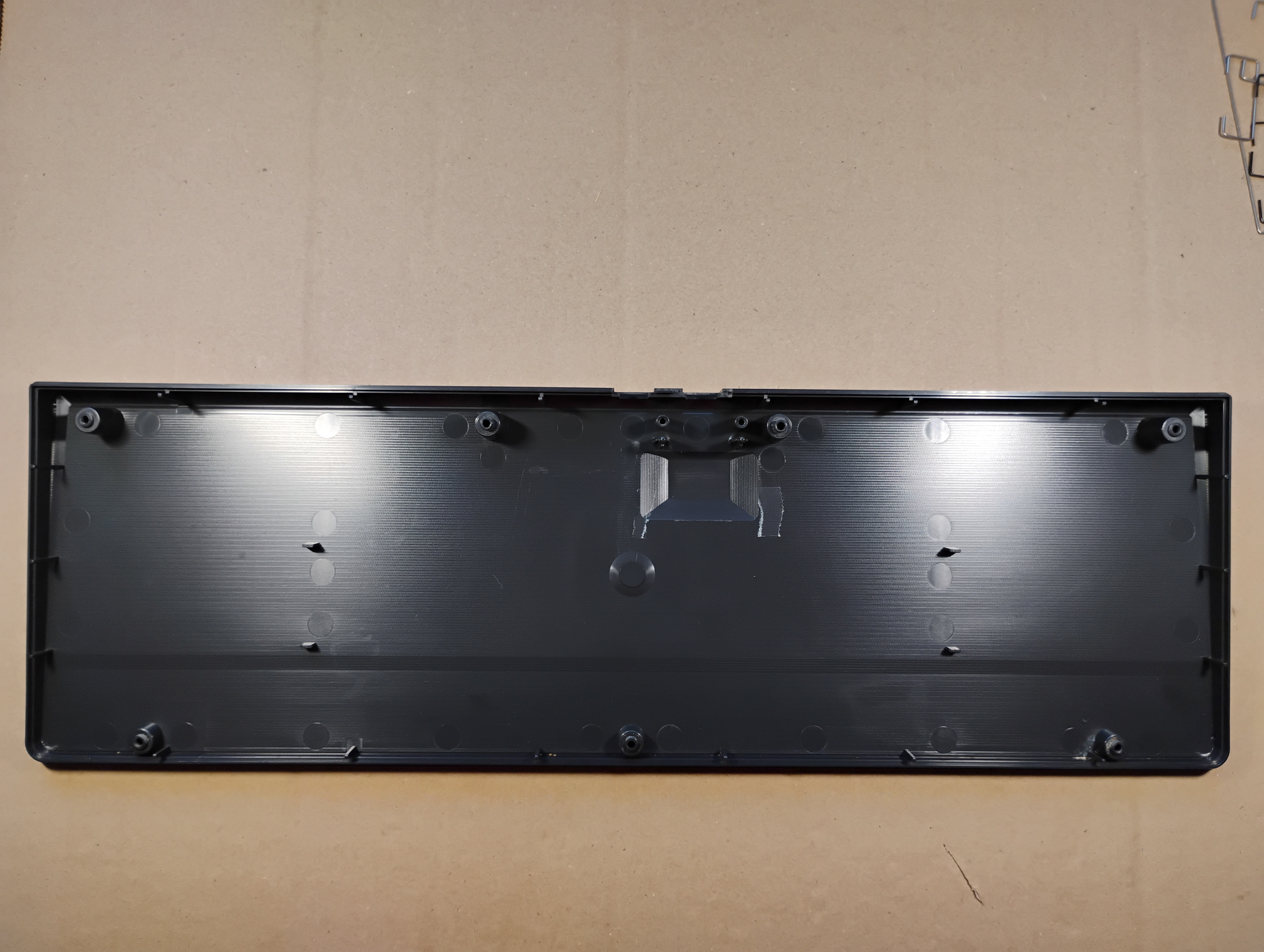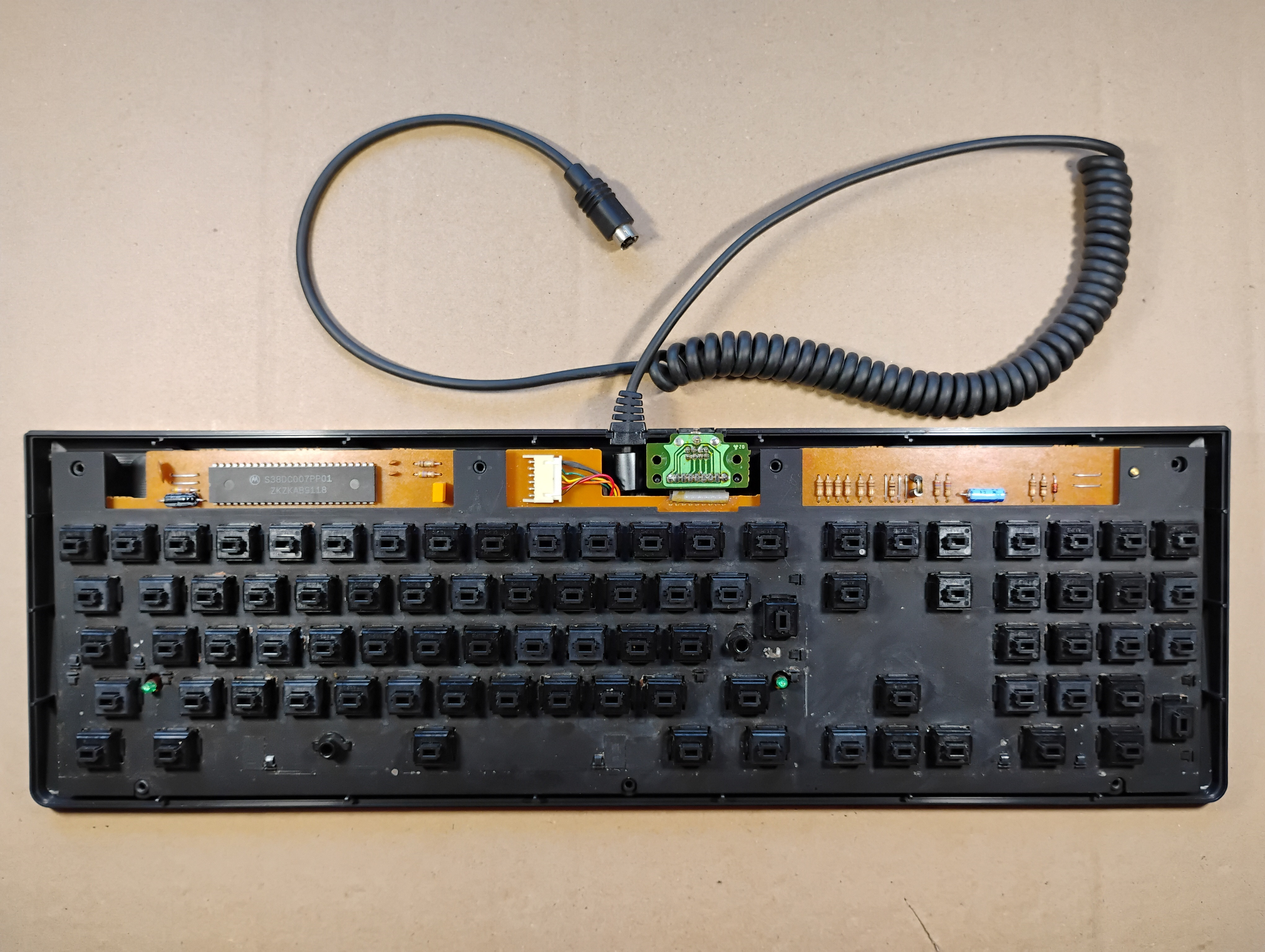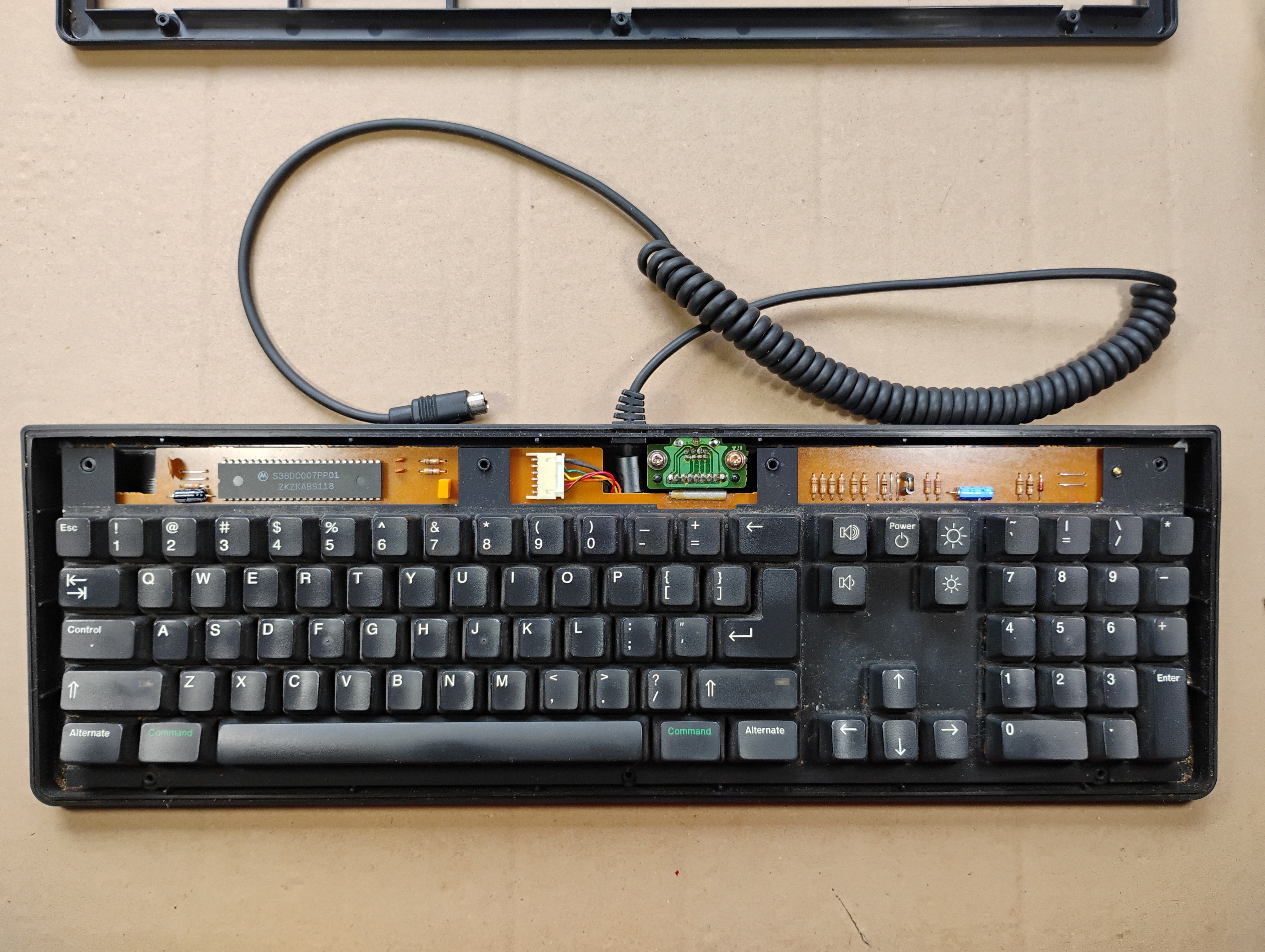 The flat cable for the mouse connector is actually pretty long and folded under the keyboard plate. The bottom cover is very dirty, and the water turned brown during cleaning... This keyboard drank coffee at one point . |