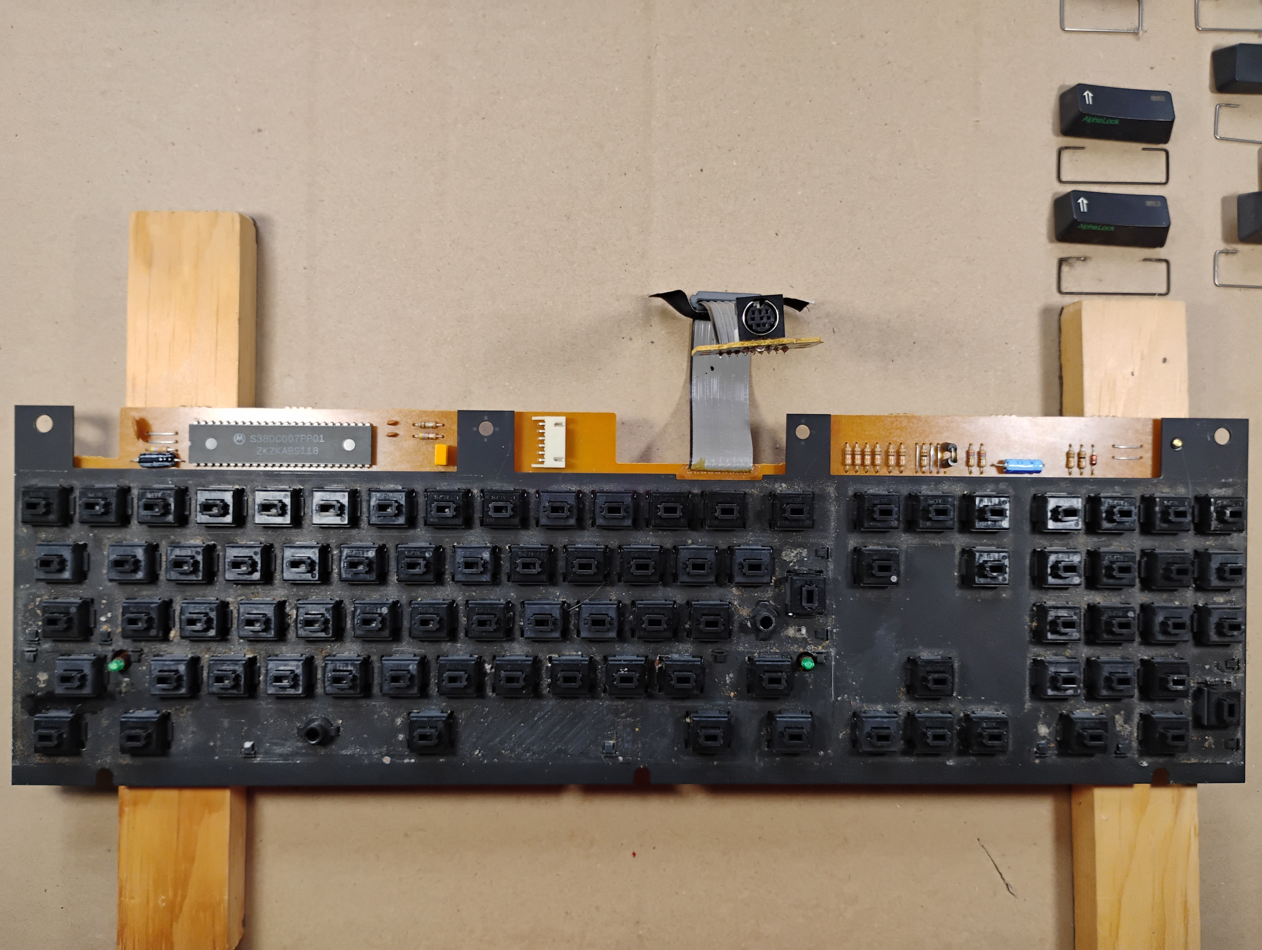 My NeXTStation ADB keyboard came "as is", which means that four keys weren't working, and it was pretty dirty . The "broken" keys were 8 in the top row, d and j in the middle row, and 0 in the num pad. Below, I show how to disassemble, clean, and fix this keyboard! The NeXTStation ADB keyboard uses Alps SKCM black key switches (cf. DeskAuthority or BergDB). I found a blueprint for these switches on eBay and a video on YouTube by Chyrosran22 that explains how to disassemble and clean one of them.